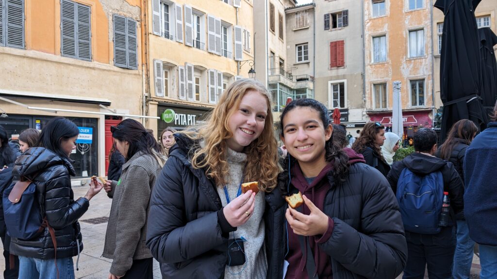 Hey guys! Today was another amazing day in France. We braved the rain as we made our way to Arles, a town close by to Avignon in the delta of the Rhône river. We visited Roman ruins and enjoyed experiencing one of the oldest open-air markets in France. The market was full of colorful produce, charcuterie, all kinds of cheeses and many other regional products. Walking through this area definitely enhanced our experience in France as the locals were excited to present their products. Lunch was DIY so we were able to try a bunch of the different cuisines Arles has to offer. Some favorites included ramen and crepes. After lunch, we went on a tour of LUMA, a cultural center /museum designed by Frank Gehry. Our favorite things included the exhibit exploring Artificial Intelligence and its effects on the art world; an exhibit of Diane Arbus’ photography that included the picture that inspired “The Shining”; and the large twisty slides where we were able to race our peers. Another feature of the building that we appreciated were the salt walls, which naturally removed moisture from the air, replacing the need for air conditioning. Au Revoir!