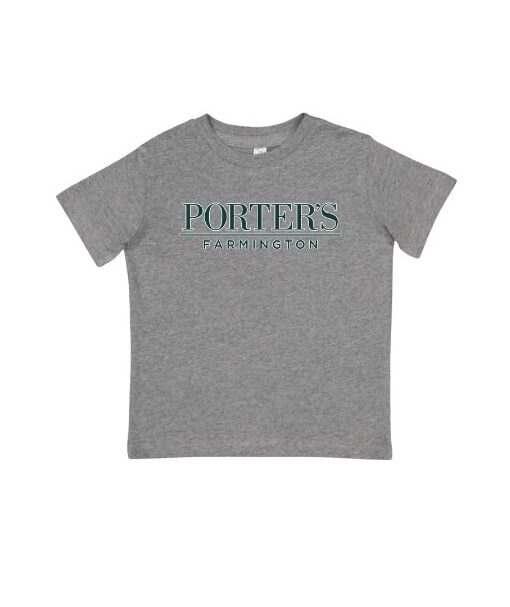 Toddler size t-shirt in charcoal gray with an imprint of “PORTER’S / FARMINGTON” in green and a white outline centered on the chest. Soft feel made from 60% cotton / 40% polyester.