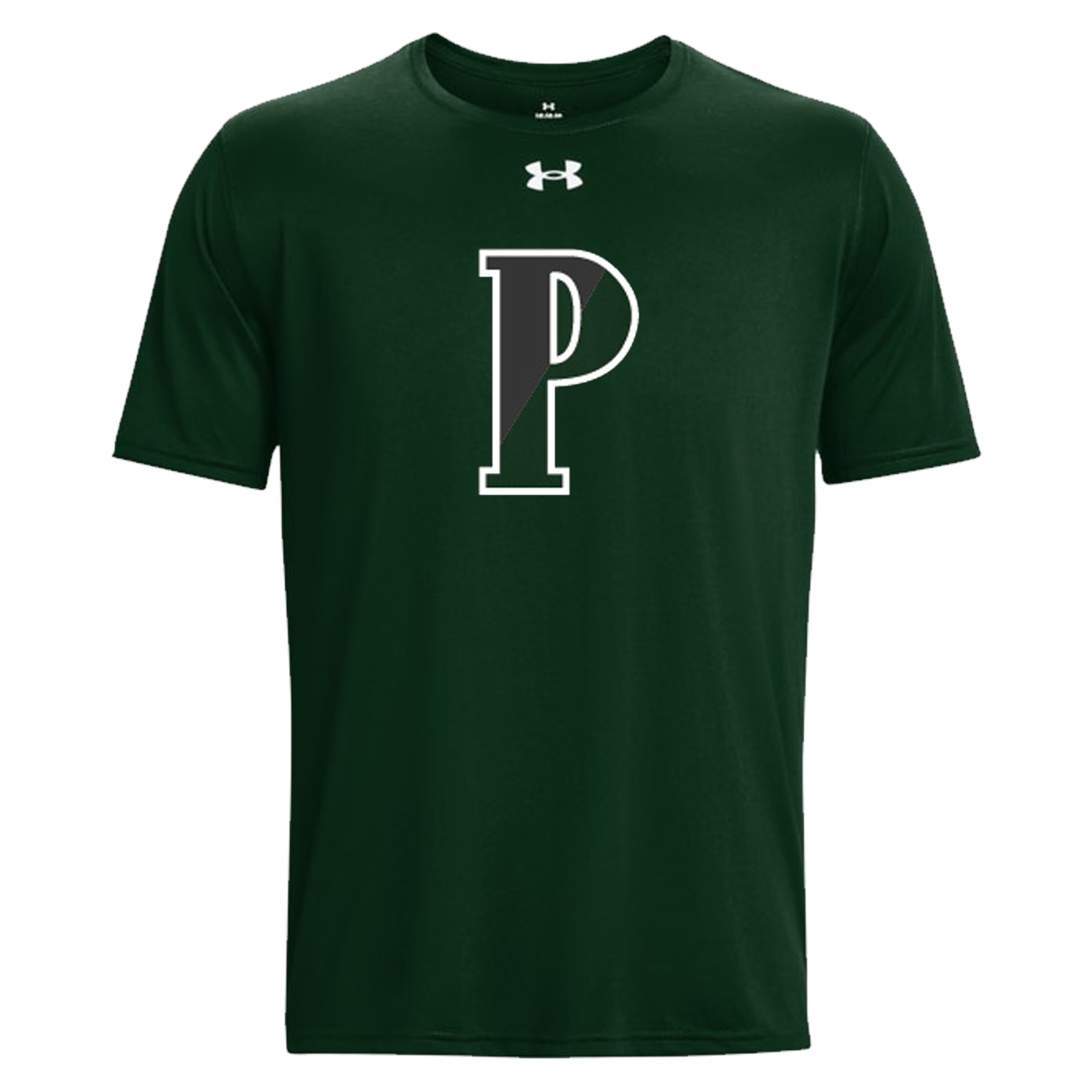 Dark green Under Armour t-shirt with Porter’s “athletic split P” imprinted on the front. Breathable, moisture wicking, light weight and soft. Loose fit.