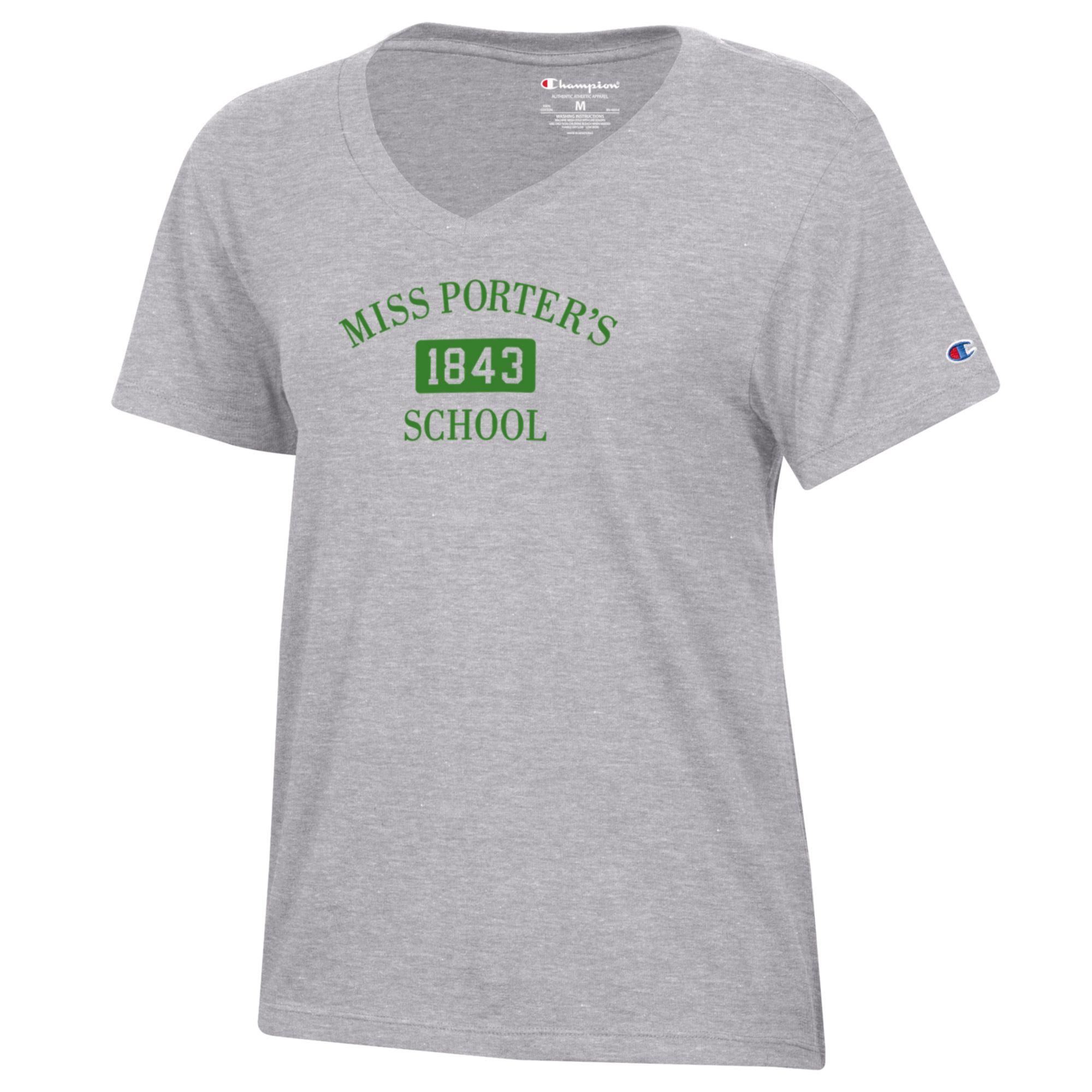 Champion brand women’s short sleeve, v-neck gray tshirt with the MPS legacy logo. 60% cotton / 40% polyester.