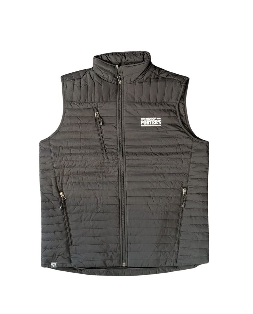 Storm Creek quilted performance vest in black with “Men of Porter’s” embroidered on left chest in white. Water-resistant, windproof, and soft. Zippered hand and chest pocket, drawcord at hem for added warmth and fit adjustment. 120 GSM Thermolite insulation. One inch horizontal quilt pattern. Water resistant and windproof.